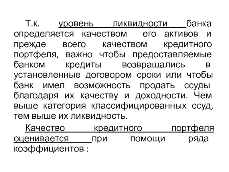 Слайд 10 Т.к. уровень ликвидности банка определяется качеством его активов и прежде