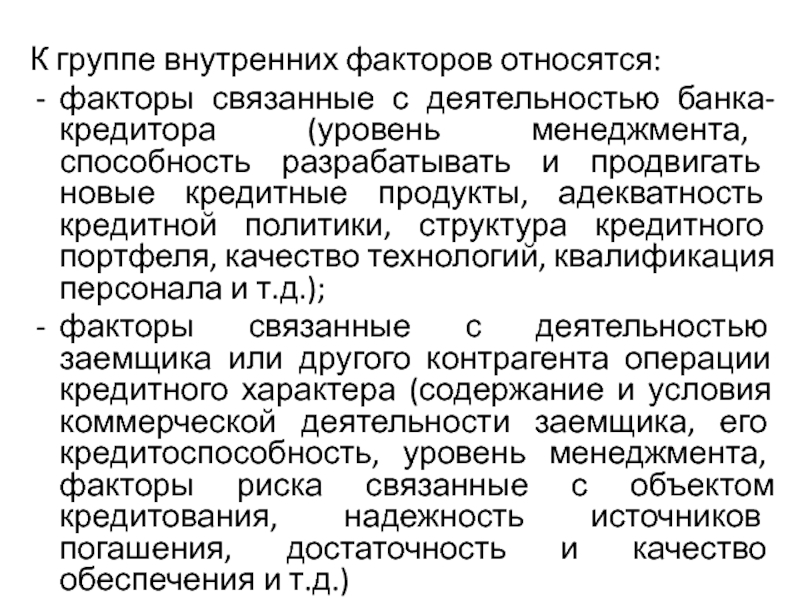 Факторы кредитного риска подразделяются на внутренние и внешние.