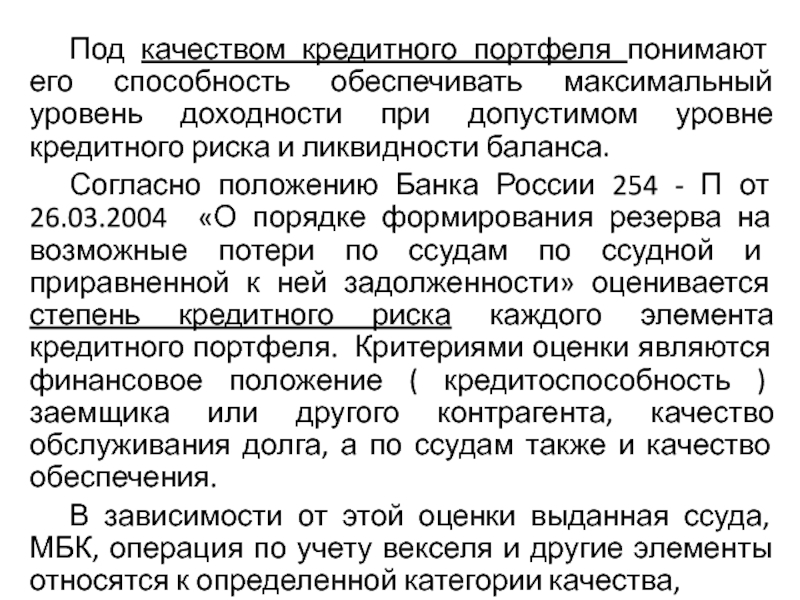 Слайд 6 Под качеством кредитного портфеля понимают его способность обеспечивать максимальный