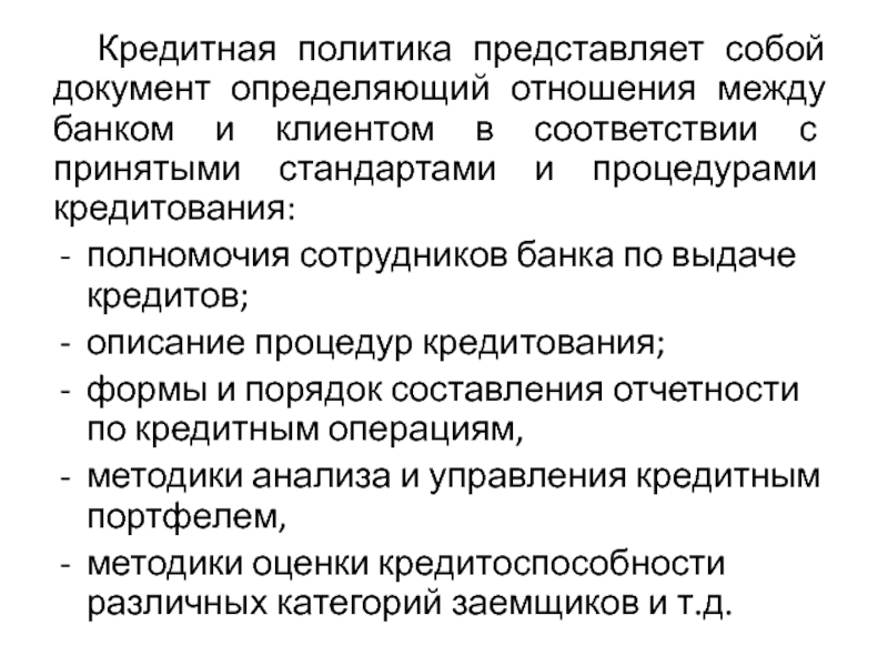 Слайд 14 Кредитная политика представляет собой документ определяющий отношения между банком и