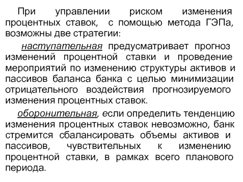 Слайд 10 При управлении риском изменения процентных ставок, с помощью метода ГЭПа,