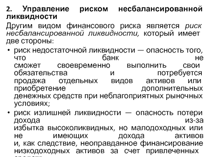 Риск несбалансированной ликвидности первоначально приводит к, технической неплатежеспособности банка, что выражается в недостаточности денежной наличности для выполнения обязательств банка.