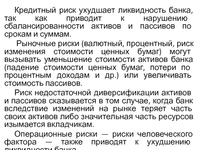 Риск несбалансированной ликвидности тесно связан с такими рисками, как кредитный, рыночный, риск пассивных операций, риск недостаточной диверсификации активов, операционные риски.