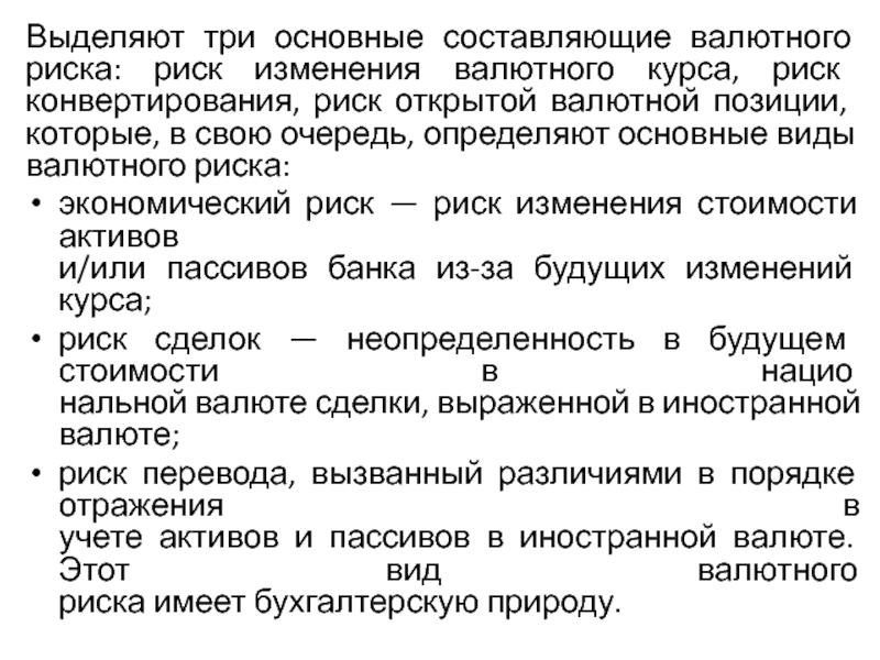 риск конвертирования, риск открытой валютной позиции, которые, в свою очередь,