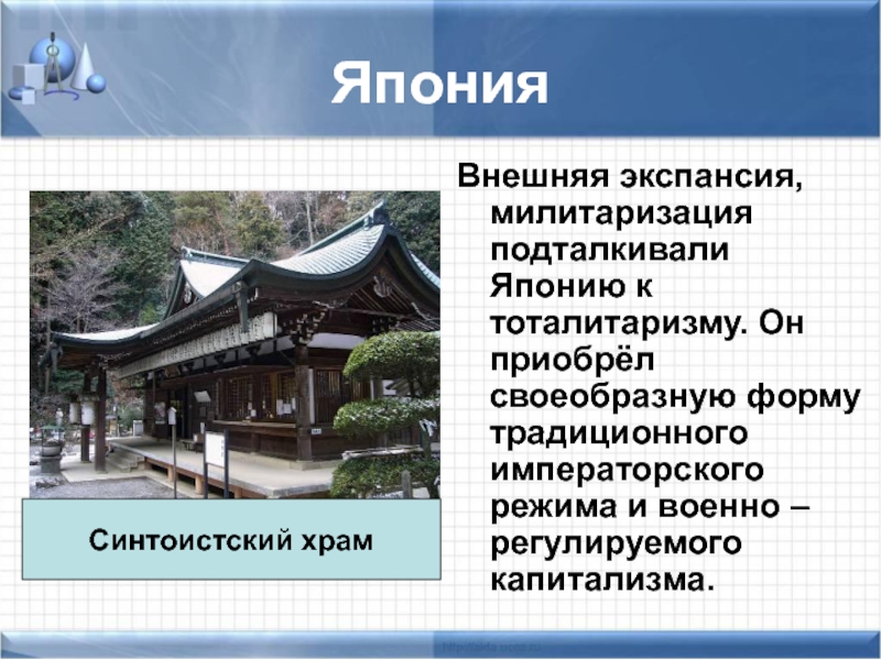 Внешняя экспансия, милитаризация подталкивали Японию к тоталитаризму. Он приобрёл своеобразную