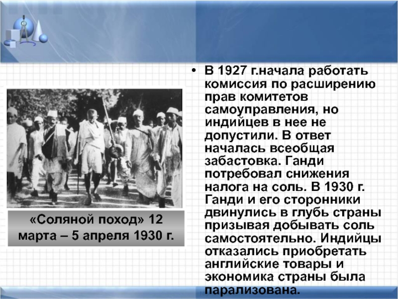забастовка. Ганди потребовал снижения налога на соль. В 1930 г. Ганди и его сторонники двинулись в глубь страны призывая добывать соль самостоятельно. Индийцы отказались приобретать английские товары и экономика страны была парализована.