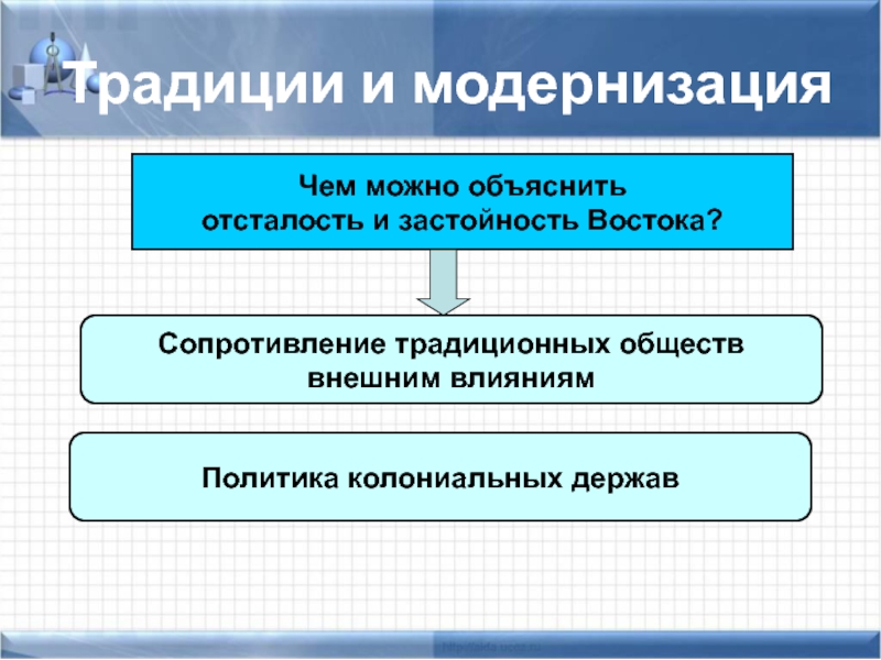 « Восток» ( отсталый Восток», « передовой Запад») В начале века обнажился большой разрыв между динамичным научно – техническим и социальным развитие стран Запада и застойным состоянием азиатских и африканских стран.
