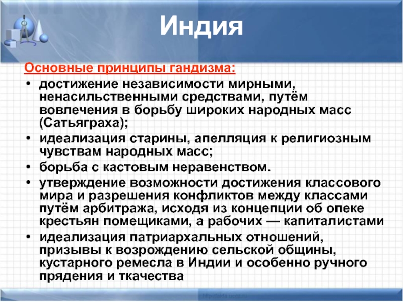 идеализация патриархальных отношений, призывы к возрождению сельской общины, кустарного ремесла в Индии и особенно ручного прядения и ткачества