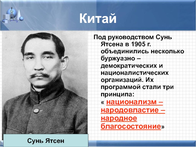 Под руководством Сунь Ятсена в 1905 г. объединились несколько буржуазно
