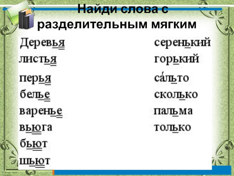Слайд 7 Найди слова с разделительным мягким знаком