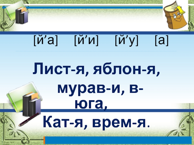 [й’а]   [й’и]   [й’у]   [а]  Лист-я, яблон-я,   мурав-и,