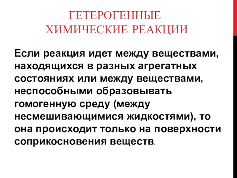 Гетерогенные реакции протекают на поверхности соприкосновения реагирующих веществ. Нарушение правильной структуры кристаллической решётки приводит к тому, что частицы на поверхности образующихся микрокристаллов значительно реакционноспособнее, чем те же частицы на «гладкой» поверхности.