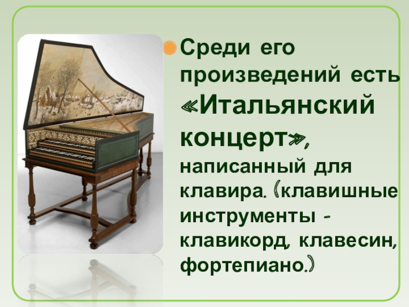 Слайд 24Среди его произведений есть «Итальянский концерт», написанный для клавира. (клавишные