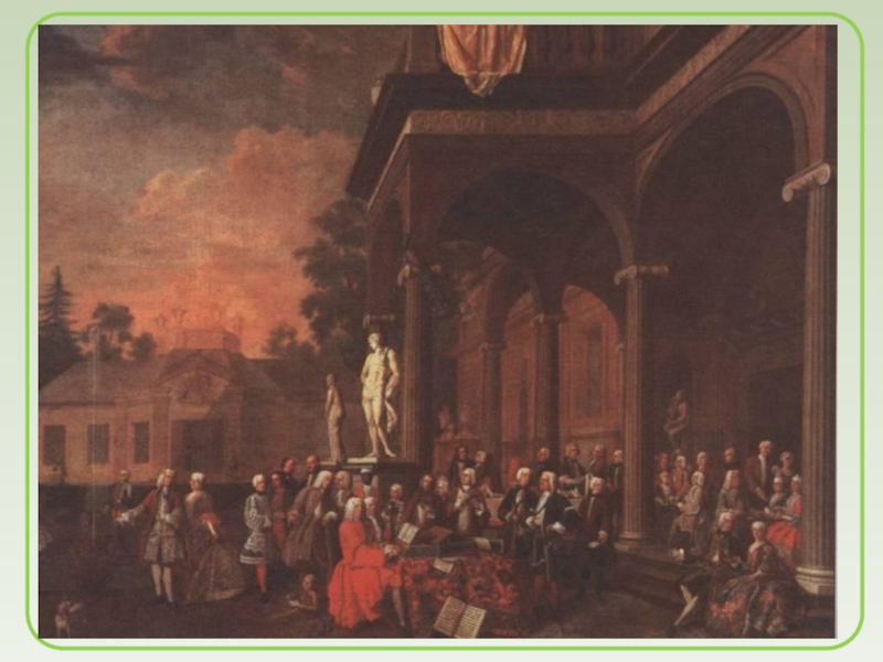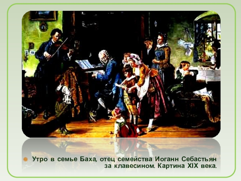 Слайд 22Утро в семье Баха, отец семейства Иоганн Себастьян за клавесином.