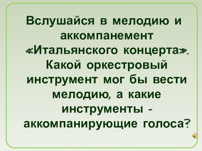 Слайд 28Вслушайся в мелодию и аккомпанемент «Итальянского концерта». Какой оркестровый инструмент