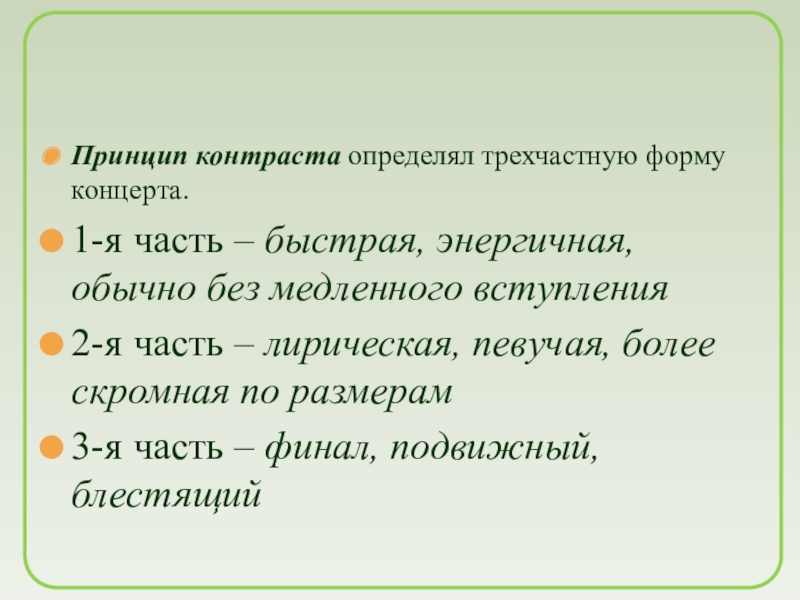 Слайд 8Принцип контраста определял трехчастную форму концерта.