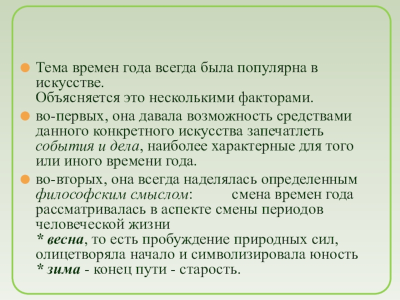 Слайд 11Тема времен года всегда была популярна в искусстве.