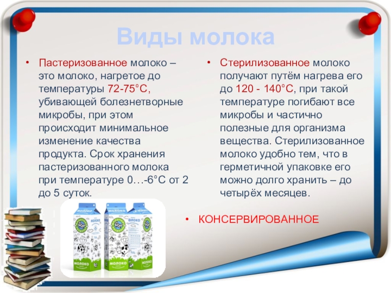 Стерилизованное молоко получают путём нагрева его до 120 - 140°С, при такой температуре погибают все микробы и частично полезные для организма вещества. Стерилизованное молоко удобно тем, что в герметичной упаковке его можно долго хранить – до четырёх месяцев.