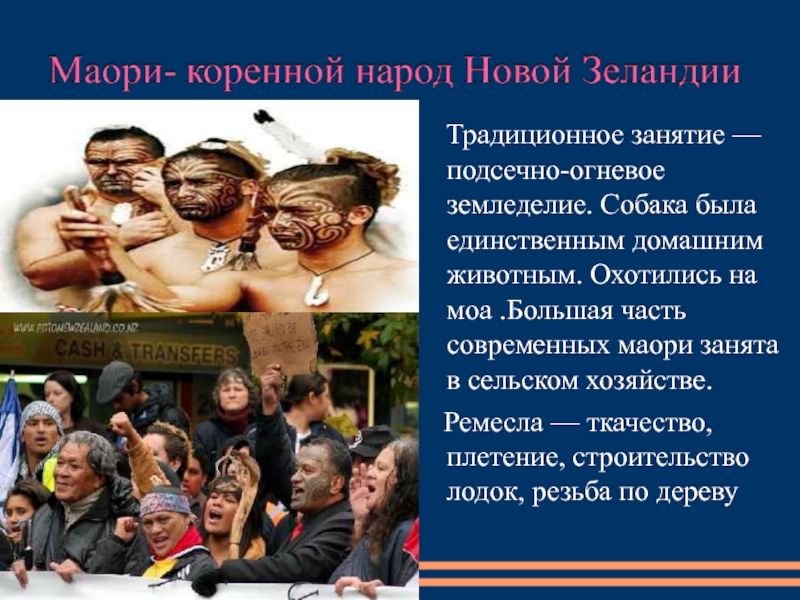 животным. Охотились на моа .Большая часть современных маори занята в сельском