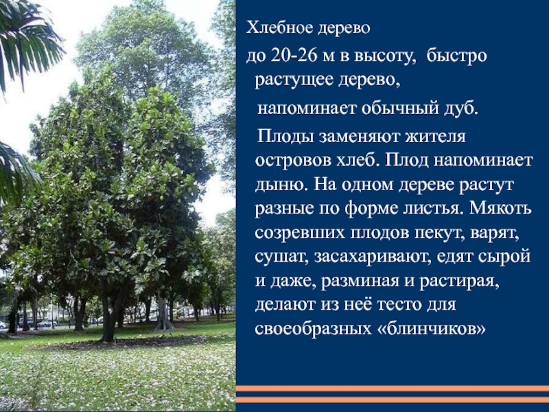 Плоды заменяют жителя островов хлеб. Плод напоминает дыню. На одном дереве растут разные по форме листья. Мякоть созревших плодов пекут, варят, сушат, засахаривают, едят сырой и даже, разминая и растирая, делают из неё тесто для своеобразных «блинчиков»