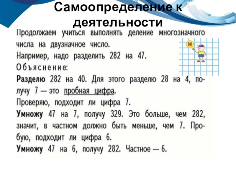 Цели: продолжать учить выполнять письменное деление многозначного числа на двузначное; совершенствовать вычислительные навыки, умение решать уравнения и