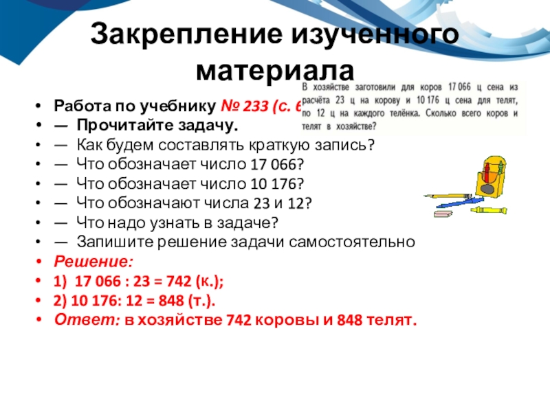 Закрепление изученного материала Работа по учебнику № 233 (с. 61).— Прочитайте задачу.— Как будем составлять краткую запись?