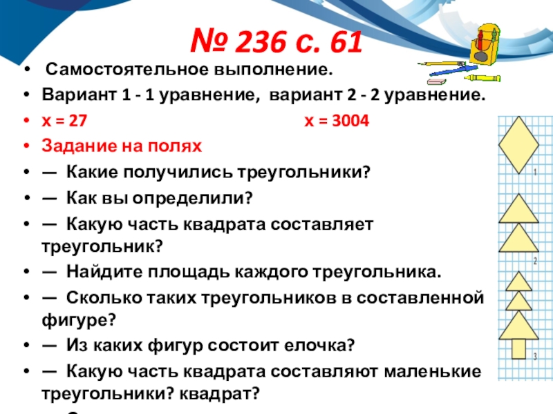 № 236 с. 61 Самостоятельное выполнение. Вариант 1 - 1 уравнение, вариант 2 - 2 уравнение. х