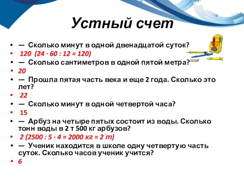 Устный счет— Сколько минут в одной двенадцатой суток? 120 (24 ∙ 60 : 12 = 120)— Сколько