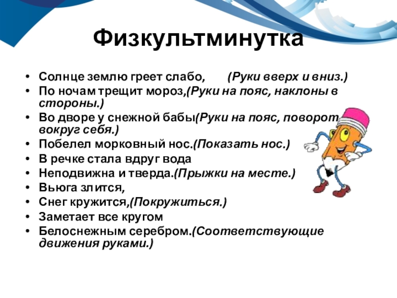 ФизкультминуткаСолнце землю греет слабо,    (Руки вверх и вниз.)По ночам трещит мороз,(Руки на пояс, наклоны