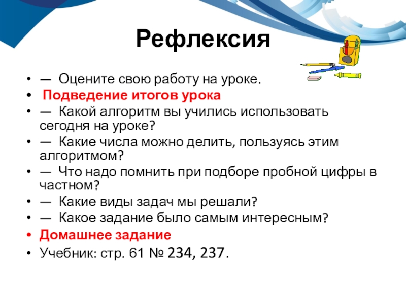 Рефлексия— Оцените свою работу на уроке. Подведение итогов урока— Какой алгоритм вы учились использовать сегодня на уроке?—