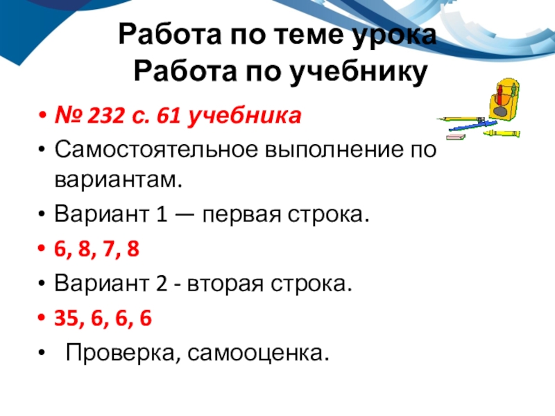 Работа по теме урока  Работа по учебнику№ 232 с. 61 учебникаСамостоятельное выполнение по вариантам. Вариант 1