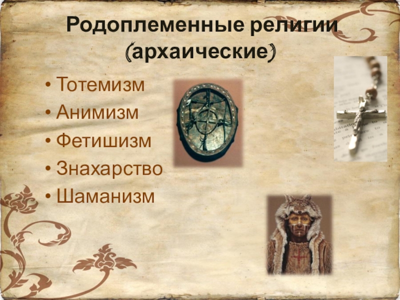 Родоплеменные религии (архаические)ТотемизмАнимизмФетишизмЗнахарствоШаманизм