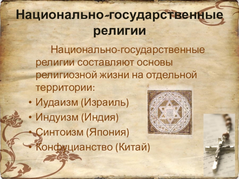 Национально-государственные религии		Национально-государственные религии составляют основы религиозной жизни на отдельной территории:Иудаизм (Израиль)Индуизм (Индия)Синтоизм (Япония)Конфуцианство (Китай)