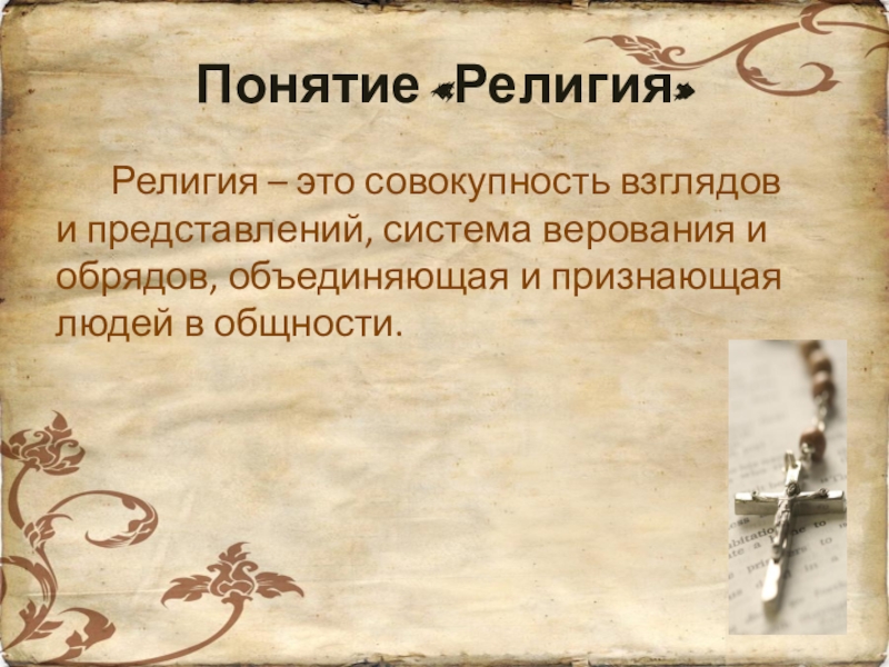 Понятие «Религия» Религия – это совокупность взглядов и представлений, система верования и обрядов, объединяющая и признающая людей в общности.