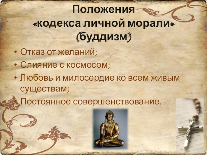 Положения  «кодекса личной морали» (буддизм)Отказ от желаний;Слияние с космосом;Любовь и милосердие ко всем живым существам;Постоянное совершенствование.