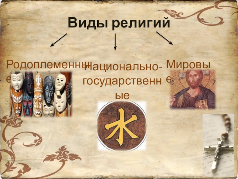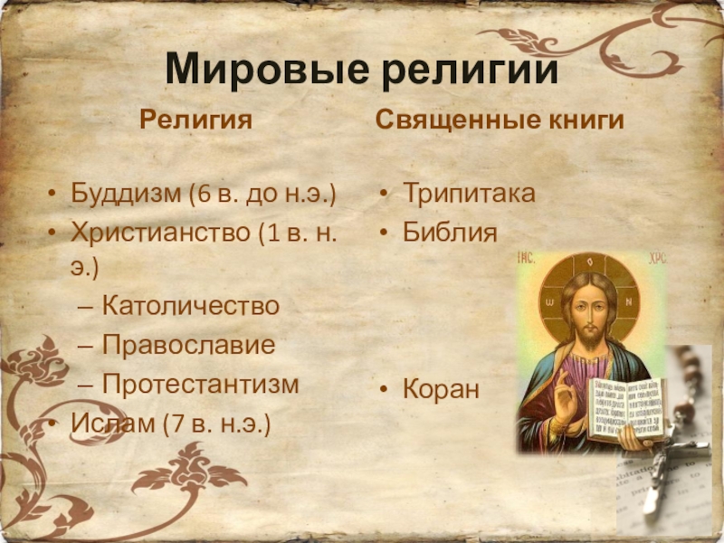 Мировые религииРелигияБуддизм (6 в. до н.э.) Христианство (1 в. н.э.) КатоличествоПравославиеПротестантизмИслам (7 в. н.э.)Священные книгиТрипитакаБиблияКоран