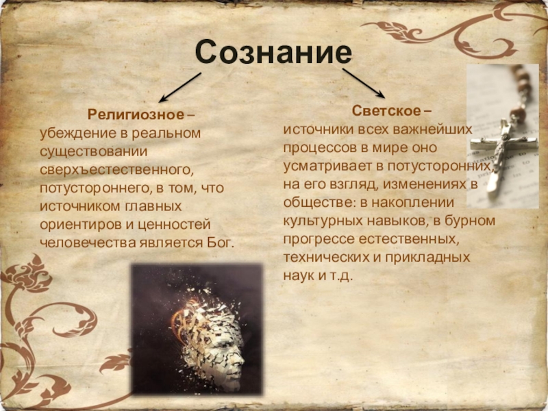 СознаниеРелигиозное – убеждение в реальном существовании сверхъестественного,потустороннего, в том, что источником главных ориентиров и ценностей человечества является