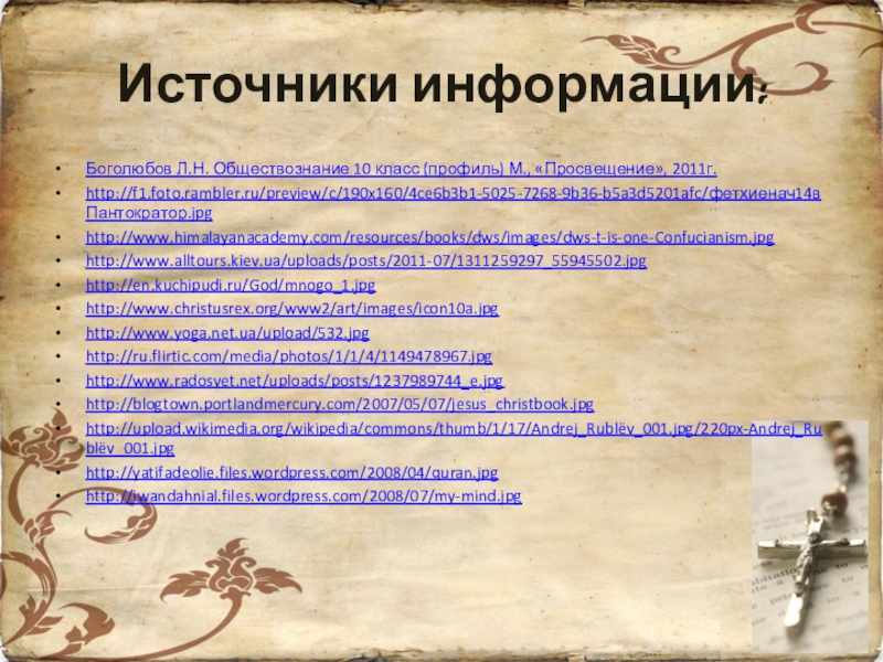 Источники информации:Боголюбов Л.Н. Обществознание 10 класс (профиль) М., «Просвещение», 2011г.http://f1.foto.rambler.ru/preview/c/190x160/4ce6b3b1-5025-7268-9b36-b5a3d5201afc/фетхиенач14вПантократор.jpghttp://www.himalayanacademy.com/resources/books/dws/images/dws-t-is-one-Confucianism.jpghttp://www.alltours.kiev.ua/uploads/posts/2011-07/1311259297_55945502.jpghttp://en.kuchipudi.ru/God/mnogo_1.jpghttp://www.christusrex.org/www2/art/images/icon10a.jpghttp://www.yoga.net.ua/upload/532.jpghttp://ru.flirtic.com/media/photos/1/1/4/1149478967.jpghttp://www.radosvet.net/uploads/posts/1237989744_e.jpghttp://blogtown.portlandmercury.com/2007/05/07/jesus_christbook.jpghttp://upload.wikimedia.org/wikipedia/commons/thumb/1/17/Andrej_Rublëv_001.jpg/220px-Andrej_Rublëv_001.jpghttp://yatifadeolie.files.wordpress.com/2008/04/quran.jpghttp://iwandahnial.files.wordpress.com/2008/07/my-mind.jpg