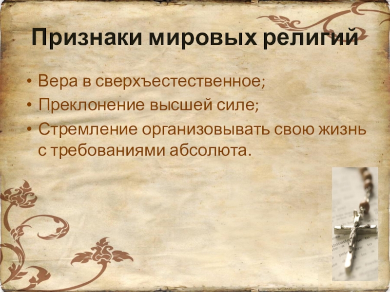 Признаки мировых религийВера в сверхъестественное;Преклонение высшей силе;Стремление организовывать свою жизнь с требованиями абсолюта.