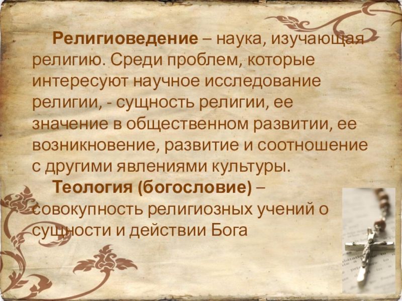 Религиоведение – наука, изучающая религию. Среди проблем, которые интересуют научное исследование религии, - сущность религии, ее значение