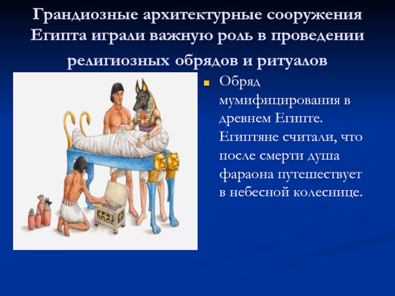 Слайд 5Грандиозные архитектурные сооружения Египта играли важную роль в проведении религиозных