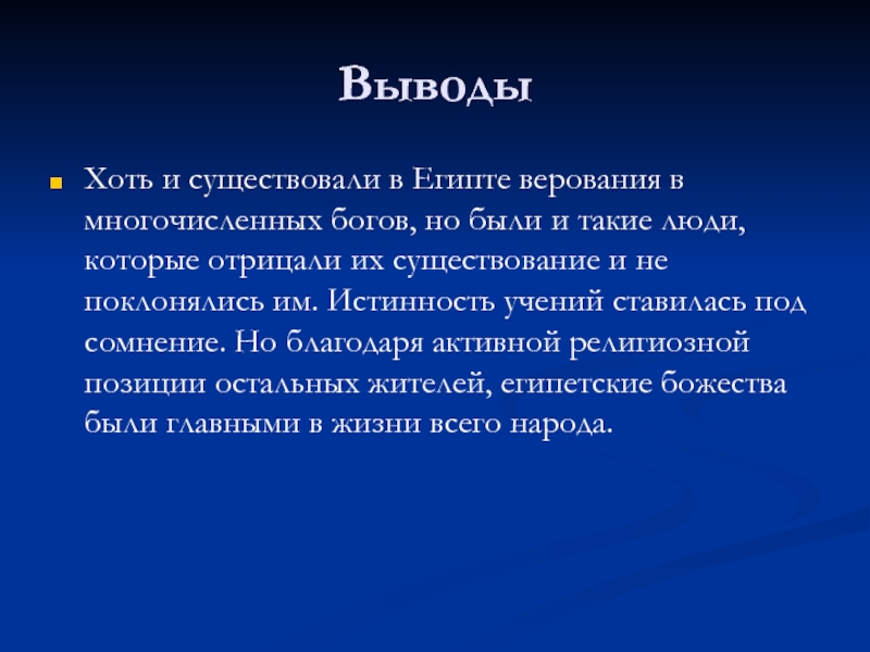 поклонялись им. Истинность учений ставилась под сомнение. Но благодаря активной религиозной позиции остальных жителей, египетские божества были главными в жизни всего народа.