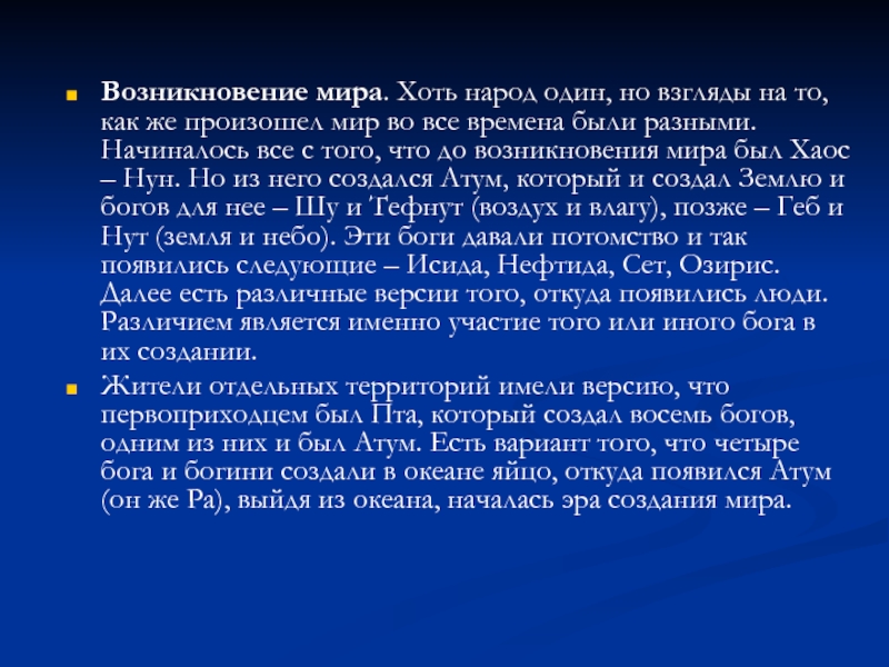 с того, что до возникновения мира был Хаос – Нун. Но из него создался Атум, который и создал Землю и богов для нее – Шу и Тефнут (воздух и влагу), позже – Геб и Нут (земля и небо). Эти боги давали потомство и так появились следующие – Исида, Нефтида, Сет, Озирис. Далее есть различные версии того, откуда появились люди. Различием является именно участие того или иного бога в их создании.