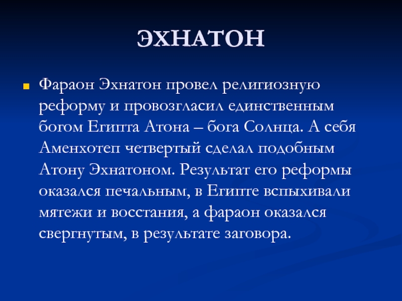 Атону Эхнатоном. Результат его реформы оказался печальным, в Египте вспыхивали мятежи и восстания, а фараон оказался свергнутым, в результате заговора.
