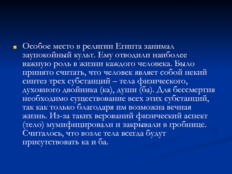 что человек являет собой некий синтез трех субстанций – тела физического, духовного двойника (ка), души (ба). Для бессмертия необходимо существование всех этих субстанций, так как только благодаря им возможна вечная жизнь. Из-за таких верований физический аспект (тело) мумифицировали и закрывали в гробнице. Считалось, что возле тела всегда будут присутствовать ка и ба.