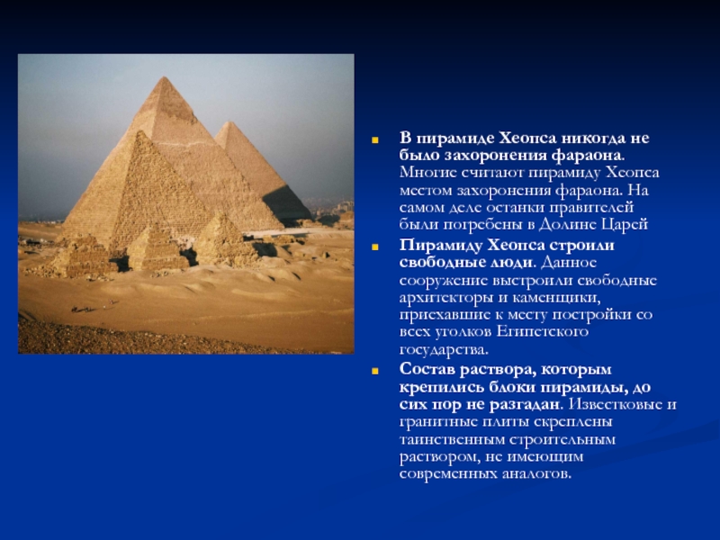 Слайд 4В пирамиде Хеопса никогда не было захоронения фараона. Многие считают