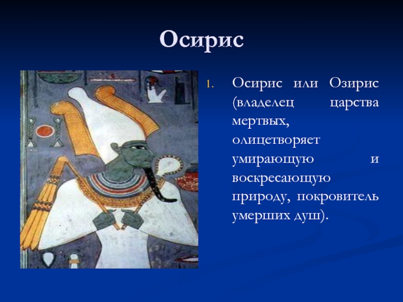 Осирис или Озирис (владелец царства мертвых, олицетворяет умирающую и воскресающую