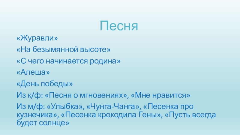 Из м/ф: «Улыбка», «Чунга-Чанга», «Песенка про кузнечика», «Песенка