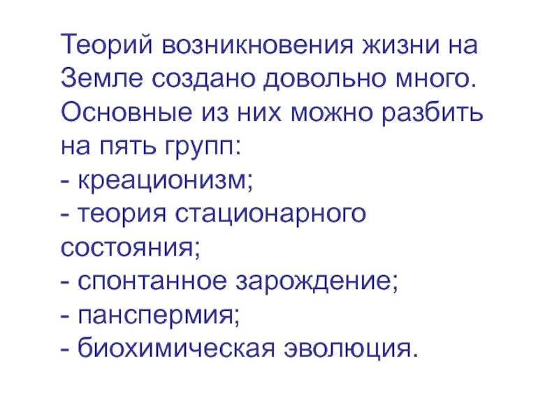 Слайд 2Теорий возникновения жизни на Земле создано довольно много. Основные из