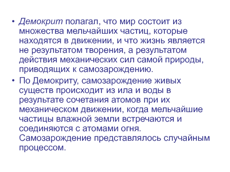 По Демокриту, самозарождение живых существ происходит из ила и воды в результате сочетания атомов при их механическом движении, когда мельчайшие частицы влажной земли встречаются и соединяются с атомами огня. Самозарождение представлялось случайным процессом.